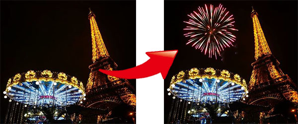 「カラフルで大きな花火」のプロンプトで画像を自動挿入