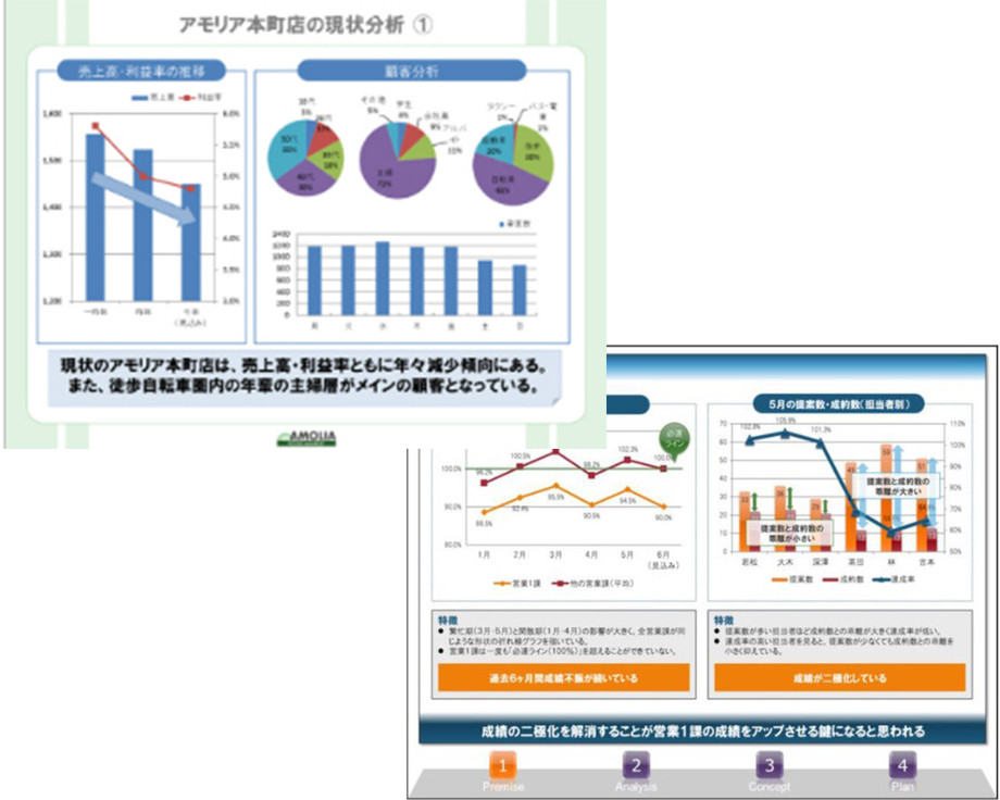 - グラフ(エクセル)、チャート図(パワーポイント)を用いて、数値から見える課題がひと目でわかる